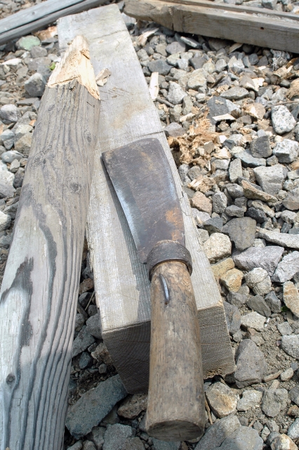 一般的に売っている薪であれば目安として半分、大きめの薪であれば3等分(厳格でなくて良い)くらいに鉈を使って薪を割り細めの薪を適度に準備しておきます。