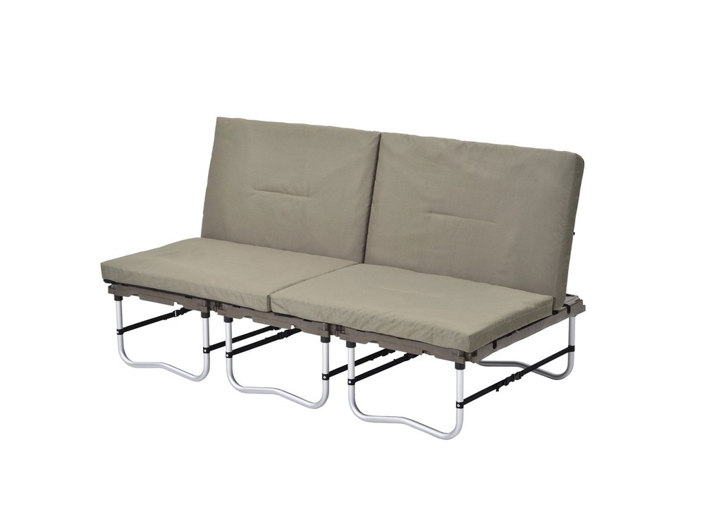 この製品は、ソファー、コット、チェアにラックとそのシーンに応じて変化させることができるマルチなキャンプギアです。