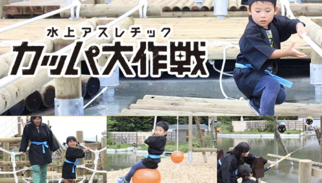 「カッパ大作戦」は水上に設置された巨大なアスレチックで園内の湖に浮かぶ15種類に陸上の3種類を含めた全18種類のアイテムで構成されています。
