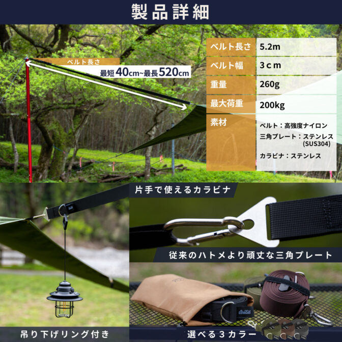 【サイズ】長さ5.2m、幅3.0cm【重量】260g【最大荷重】200kg【素材】高強度ナイロン、ステンレス(SUS304)内径Φ9mmの三角プレート【カラビナ】ステンレス