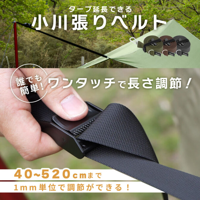 【小川張り専用ベルト】DaLaCaの小川張り専用タープ延長ベルトなら従来の小川張りベルトの様な段階的な調節ではなく、1mm単位の調節が出来るので今まで微妙に調整幅が合わず弛んだりシワになってしまっていたタープもベテランキャンパーの様に綺麗に張ることが出来ます。次回のキャンプがより一層楽しくなること間違いなしです。快適なサイト作りを目指して、ぜひお試しください!