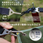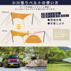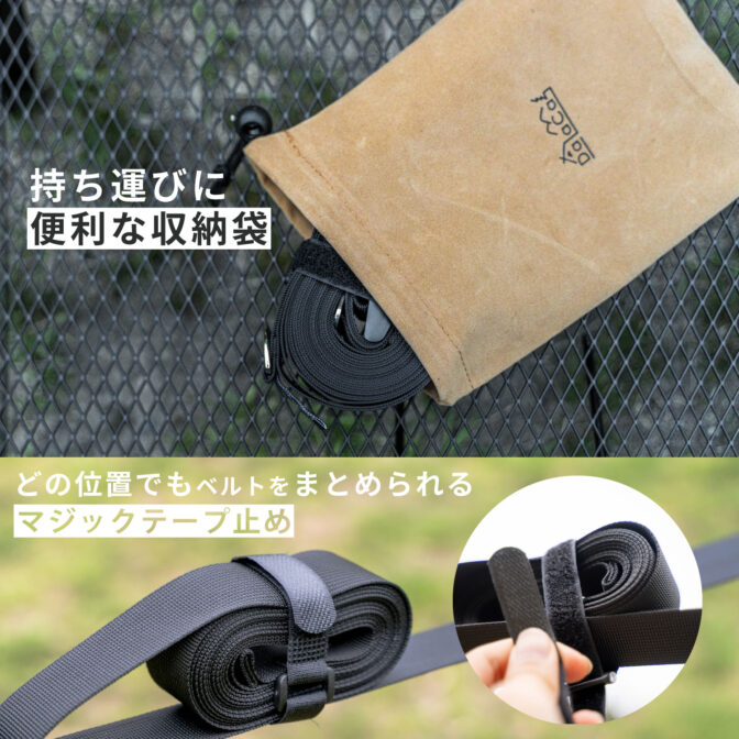 【こだわりの付属品】DaLaCaは付属品にもこだわります。カラビナはステンレス製で強度と錆に強く他社製品でよく使われている回して使用する煩わしいタイプの物ではなく、ワンアクションでハトメにも掛けられるカラビナを採用。使用時に余ったベルトを纏めるマジックテープ付きだから見た目も良く風の強い日でも余ったベルトがポールに絡まる心配もありません。小川張り専用タープ延長ベルトの使用説明書付きです!