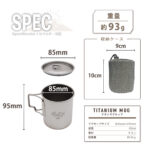 <スペック> サイズ:【本体】Φ8.5cm×9.5cm 74g 【蓋】18g 素材:チタン 商標登録番号:第6271285号