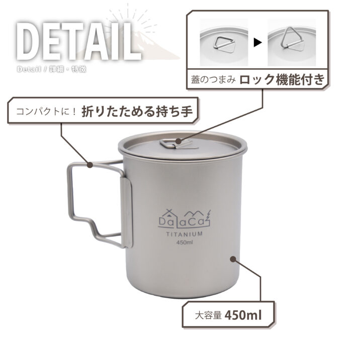 <大容量の450ml>コンパクトで持ち運びのしやすいDaLaCaチタンマグカップですが、コンパクトな見た目とは裏腹に内容量は様々なシーンで約に立つ450mlの大容量!