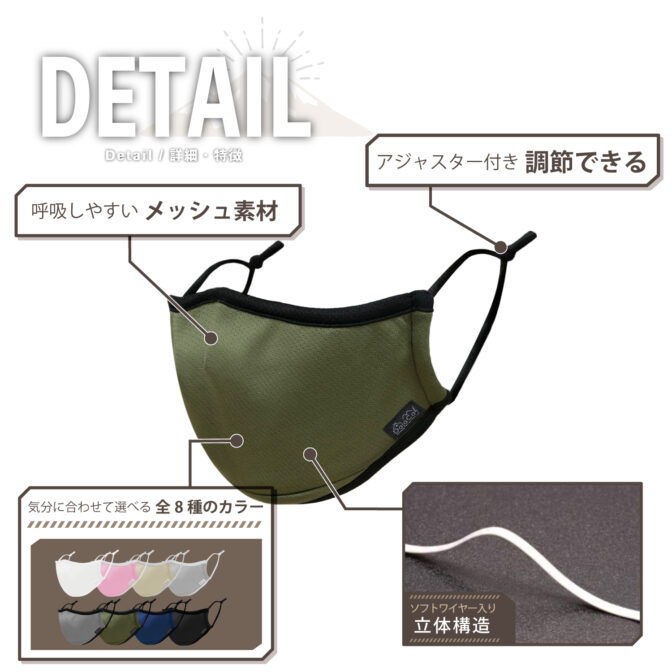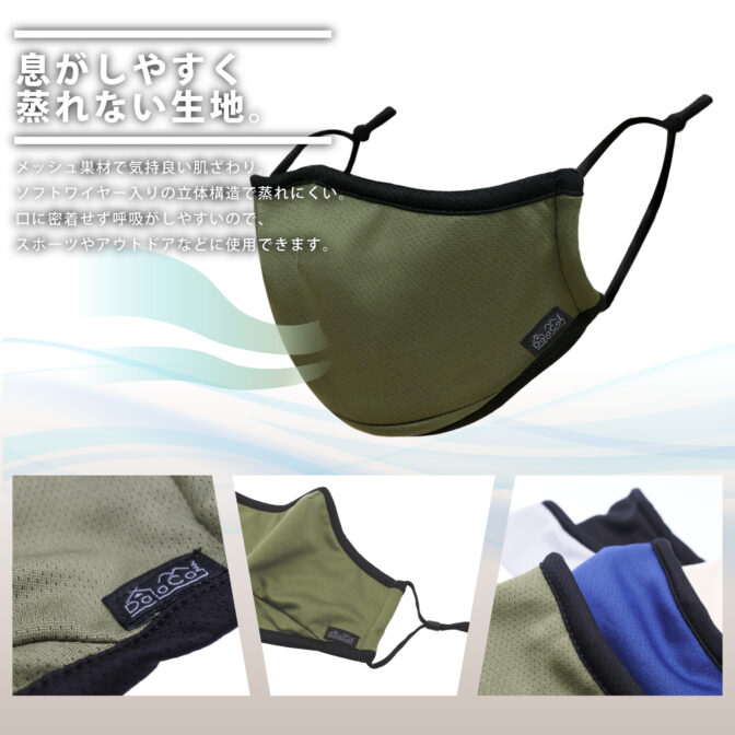 <息がしやすく蒸れないメッシュ生地>肌に接する面はメッシュ素材でさらっとした肌触り。繰り返し洗えるマスクで、メッシュ生地を使用していますので、蒸れなどの不快感を減らしてくれます。肌触りと着け心地を追求し、長時間の装着でも蒸れにくく苦になりません。また立体構造ですのでマスクが口にくっつきにくく呼吸しやすいです。アウトドアなど体を動かすシーンで快適にお使いいただけます。